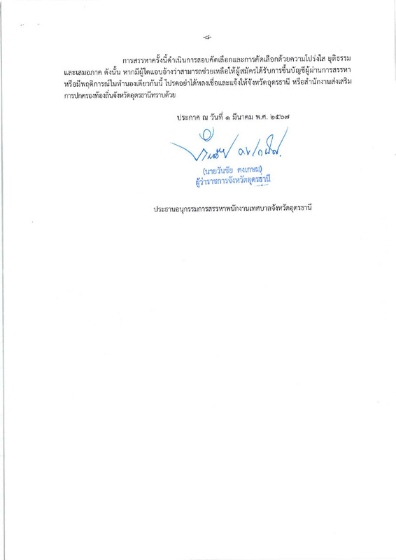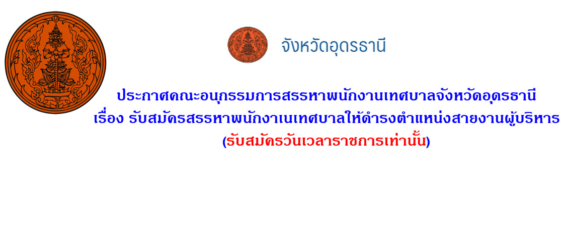 ประกาศคณะอนุกรรมการสรรหาพนักงานเทศบาลจังหวัดอุดรธานี เรื่อง รับสมัครสรรหาพนักงาเนเทศบาลให้ดำรงตำแหน่งสายงานผู้บริหาร (รับสมัครวันเวลาราชการเท่านั้น)